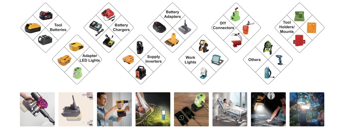 Lampe LED sans fil, batterie d'outil électrique, onduleur portable, chargeur de batterie, adaptateur de batterie,
